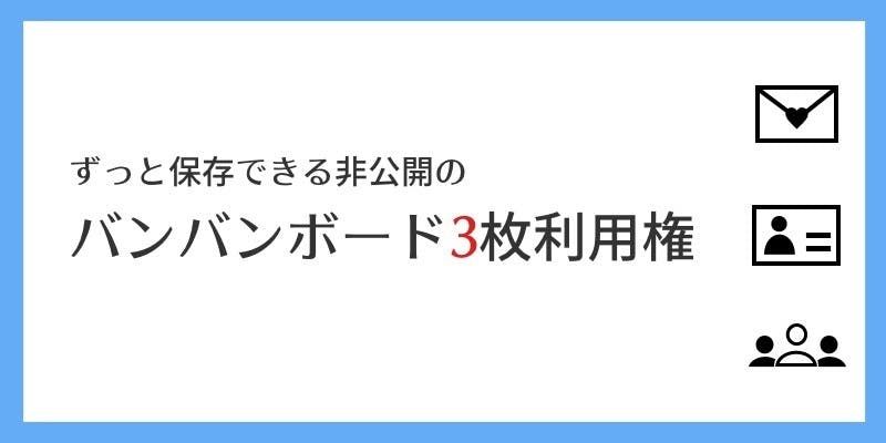 ご支援のお礼として感謝を込めて、ずっと保存できる非公開のバンバンボードをリクエストランドが続く限り0円で利用できる【バンバンボード利用権】をご用意しています。リターンの種類によって利用できる枚数が異なりますので、プロジェクトページでご確認ください。